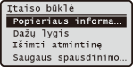 (Popieriaus pasirinkimas / parametrai) ir ekrane <Popieriaus pasirinkim.> pasirinkite popierių, kurį norite naudoti. Taip pat, jei įdedate kitokio nei buvo įdėtas anksčiau, formato popieriaus, galite paspausti šį mygtuką, jei norite keisti popieriaus parametrus. Atminkite, kad popierius bus tinkamai tiekiamas tik teisingai nustačius popieriaus parametrus.