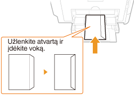 Šiame skyriuje aprašyta, kaip įdėti vokus norima kryptimi ir norima puse bei kokias procedūras reikia atlikti prieš dedant vokus. Bendrosios popieriaus įdėjimo į popieriaus stalčių arba universalųjį dėklą procedūros aprašą rasite skirsnyje Popieriaus įdėjimas į universalųjį dėklą.
