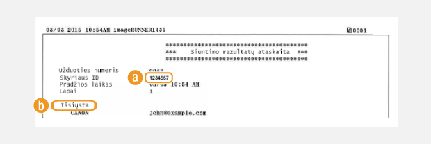 Rodomas vardas ir adresas arba paskirties vardas. Siunčiant el. paštu, ataskaita nurodo rezultatą perdavimo iš aparato į pašto serverį, o ne iš aparato į paskirties adresą. Trijų skaitmenų klaidos kodas nebus spausdinamas, net jei perdavimas ir nepavyko. Norėdami patikrinti klaidos kodą. išspausdinkite ryšių valdymo ataskaitą (