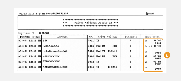 Kai rodomas klaidos kodas). Siunčiant dokumentus el. paštu, ataskaita nurodo perdavimo rezultatą iš aparato į pašto serverį, o ne iš aparato į paskirties adresą.