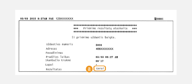 OK (Gerai) nurodo, kad faksas gautas sėkmingai, o NG ir trys skaitmenys (klaidos kodas) nurodo, kad fakso perdavimas nepavyko (
