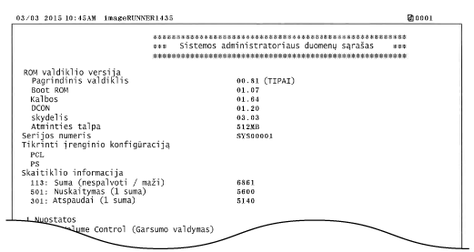 Meniu sąrašo nustatymas) ir šiuo metu galiojančius aparato nustatymus, tokius kaip popieriaus dydis ir tipas. Galima patikrinti ir informaciją apie nustatymus <Tinklo parametrai> bei <Sistemos valdymo parametrai> kuri nėra įtraukta į Naudotojo duomenų sąrašą (