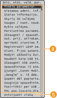 Meniu sąrašo nustatymas). Kai kurių nustatymų atveju, norint užbaigti operaciją, jums reikės perkrauti aparatą.
