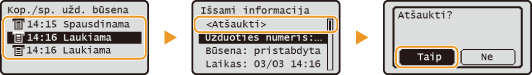 Atšaukimas naudojant „Remote UI“ (Nuotolinio naudotojo sąsaja)Spausdinimą galite atšaukti iš „Remote UI“ (Nuotolinio naudotojo sąsaja) puslapio [Job Status]: Spausdinamų dokumentų esamos būsenos tikrinimas