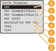 Galite rinktis iš šešių failo formatų, į kurį bus konvertuojami dokumentai: <PDF>, <PDF (kompaktiškas)>, <PDF (kompaktiškas / OCR)>, <PDF (OCR)>, <JPEG> ir <TIFF>. Nuskaityti dokumentai konvertuojami į čia nurodytą failo formatą, tada siunčiami nurodytam adresatui.