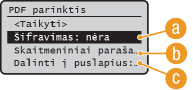 * Kai kurie elementai galimi tik įjungus pasirinktinį parametrą „Siųsti PDF saugos funkcijų rinkinį“ (Siuntimo PDF saugos funkcijų rinkinys).