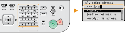 Skaičių mygtukus galite naudoti tik nurodydami pirmąjį adresatą. Jei norite nurodyti papildomus adresatus, naudokite adresų knygelę arba LDAP serverį. Norėdami nurodyti adresatus kaip kopijos ar nematomos kopijos adresatus, turite naudoti adresų knygelę.