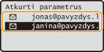 Galite pasirinkti adresatą iš paskutinių trijų naudotų adresatų. Kai nurodote anksčiau naudotą adresatą, aparatas nustato tuos pačius nuskaitymo parametrus, pavyzdžiui, tankį, kuriuos paskutinį kartą naudojote, kai siuntėte dokumentus šiam adresatui.