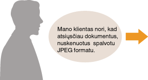 Nurodykite savo kliento el. pašto adresą naudodami <Spalvotai> ir <JPEG> nuskaitymo parametrams ir užregistruokite adresą ir parametrus <Parankiniai parametrai> kaip derinį. Dažnai naudojamų nuskaitymo parametrų registravimas (el. laiškas / bendrai naudojamas aplankas / failų serveris)