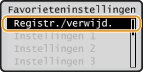 <Favoriete instellingen> <Registr./verwijd.> selecteer de instelling <Verwijderen> <Ja> .Opgeslagen instellingen worden ook behouden wanneer het apparaat wordt uitgeschakeld.