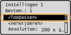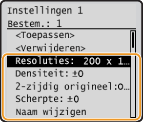 <Favoriete instellingen> <Registr./verwijd.> selecteer de instelling wijzig de instelling <Toepassen> <Ja> . Met deze procedure kunt u de bestemmingen die in de instelling zijn geregistreerd, niet wijzigen. Registreer een nieuwe instelling met de gewenste bestemmingen.Als u een opgeslagen instelling wilt verwijderen, drukt u op