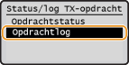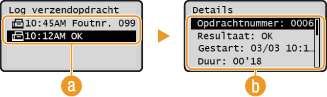 .![]() <Log verzendopdracht>/<RX-opdrachtlog>Hier ziet u een lijst met de documenten die zijn verzonden en ontvangen. <OK> geeft aan dat een document zonder problemen is verzonden of ontvangen, en <Fout> betekent dat een document niet is verzonden of ontvangen omdat de taak werd geannuleerd of omdat er een fout is opgetreden.
