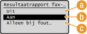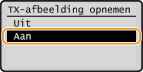 Wanneer u <Aan> of <Alleen bij fout> selecteert, kunt u een deel van een faxdocument opnemen in het rapport. Stel <TX-afbeelding opnemen> in op <Aan> en druk op  .