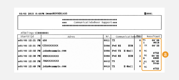 Er wordt een foutcode weergegeven). Bij documenten die u via e-mail hebt verzonden, staat het verzendingsresultaat tussen de machine en de mailserver in het rapport, en niet tussen de machine en het adres van de bestemming.