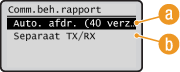 Selecteer <Aan> om de verzendings- en ontvangstresultaten afzonderlijk af te drukken, of <Uit> om beide resultaten op één vel af te drukken.