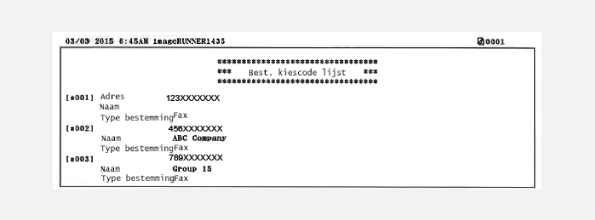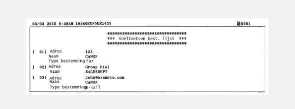 U kunt een lijst afdrukken om de details te controleren van de bestemmingen die zijn opgeslagen in het adresboek. Lijsten kunnen afzonderlijk worden afgedrukt voor de registratietypes <Kiescode>, <Sneltoets> en <Groep>.