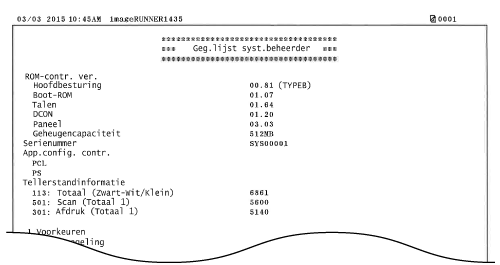 Instellingenmenu) en de huidige instellingen die in de machine staan geregistreerd, controleren, zoals papierformaat en -soort. U kunt ook de gegevens over instellingen voor <Netwerkinstellingen> en <Instellingen Systeembeheer> controleren die niet zijn opgenomen in de lijst met gebruikersgegevens (