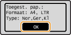Controleer of het papier dat is geladen overeenkomt met het formaat en het type op het scherm en druk op