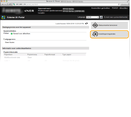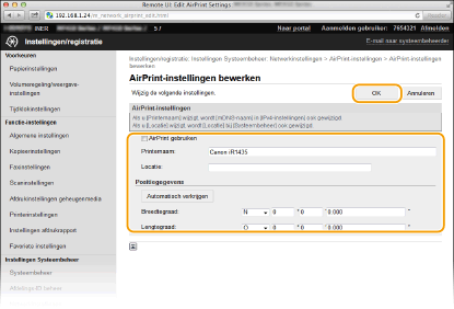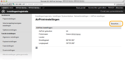 U kunt gegevens registreren die worden gebruikt voor het identificeren van de machine, zoals de naam van de machine en de installatielocatie. U kunt ook het afdrukken via AirPrint uitschakelen op de machine. U gebruikt de externe UI om deze instellingen te wijzigen.