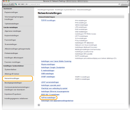 Als u functies wilt uitschakelen die u toch niet met AirPrint gebruikt of communicatie wilt versleutelen, kunt u de benodigde instellingen configureren met het bedieningspaneel.