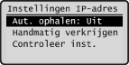 Als u DHCP niet wilt gebruiken om een IP-adres toe te wijzen Selecteer <Uit>. Wanneer u <DHCP> selecteert wanneer de DHCP-service niet beschikbaar is, zoekt de machine of er services in het netwerk beschikbaar zijn en zal sprake zijn van onnodige communicatie. |
