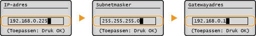 <Subnetmasker> <Gatewayadres>.Voer de instelling in met de numerieke toetsen en druk in elk scherm op