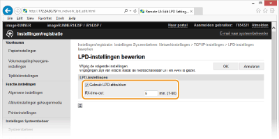 Geef een time-outperiode van 1 t/m 60 minuten op. Wanneer de opgegeven time-outperiode is verstreken, verwijdert de machine incomplete afdrukgegevens die zijn verstuurd vanaf een computer, zodat de volgende afdruktaak kan worden ontvangen. |