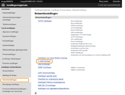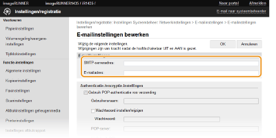 Gebruik de externe UI om e-mailinstellingen te configureren, zoals SMTP-servergegevens en TLS-versleuteling. Neem voor meer informatie over de vereiste instellingen contact op met uw internetprovider of netwerkbeheerder.