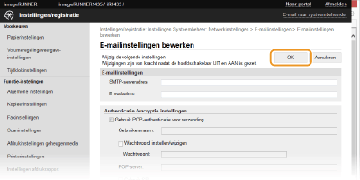 Alle e-mails in het Postvak IN op de server worden verwijderd wanneer u bij stap 6 op [OK] klikt. Als er een e-mailadres voor alledaags gebruik is opgegeven in [E-mailadres:], moet u voorzichtig te werk gaan en ongelezen e-mails niet verwijderen. Dit gebeurt minder snel als u voor de machine een afzonderlijke e-mailaccount gebruikt.