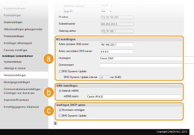 mDNS (multicast DNS) wordt ondersteund door Bonjour en is een protocol voor het koppelen van een hostnaam aan een IP-adres zonder DNS te gebruiken. Schakel dit selectievakje in om mDNS in te schakelen en voer de mDNS-naam in het vak [mDNS-naam:] in. [Instellingen DHCP-opties][Hostnaam verkrijgen:]