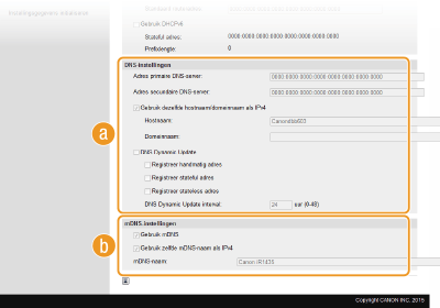 Schakel dit selectievakje in om de DNS-records dynamisch bij te werken wanneer het IP-adres van het apparaat verandert. Als u één of meer adrestypen wilt opgeven die u wilt registreren op de DNS-server, schakelt u het selectievakje [Registreer handmatig adres], [Registreer stateful adres] of [Registreer stateless adres] in. Als u een interval wilt instellen tussen updates, typt u de tijd in uren in het vak [DNS Dynamic Update interval:]. [mDNS-instellingen][Gebruik mDNS]
