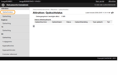 Wanneer u zich aanmeldt in de systeembeheerdersmodus, kunt u alle afdruktaken die momenteel worden verwerkt, weergeven.