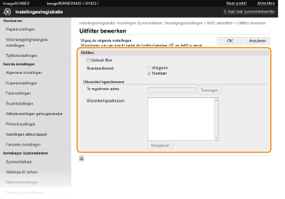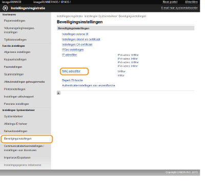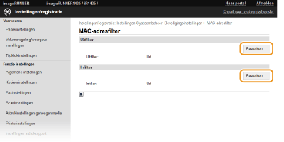 Controleren op typefouten Als u MAC-adressen verkeerd invoert, kunt u het apparaat mogelijk niet bereiken vanuit de UI op afstand. Dan moet u <MAC-adresfilter> instellen op <Uit>. MAC-adresfilter