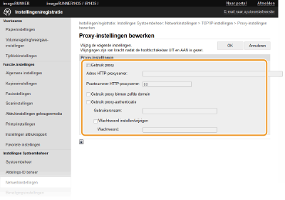Als u het wachtwoord voor proxyverificatie wilt instellen of wijzigen, schakelt u het selectievakje in en typt u maximaal 24 alfanumerieke tekens voor het nieuwe wachtwoord in het vak [Wachtwoord:].