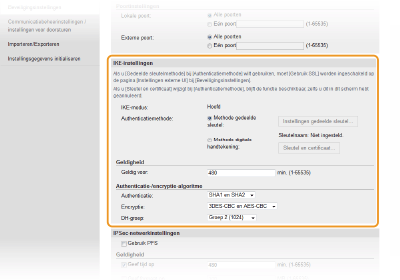Geef instellingen op voor [Geldig voor:] en [Authenticatie:]/[Encryptie:]/[DH-groep:].