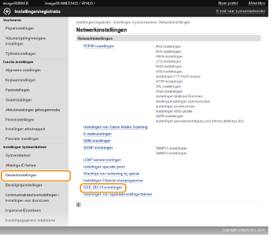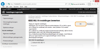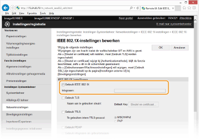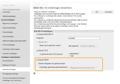 Schakel het selectievakje [Gebruik IEEE 802.1X] in, typ de aanmeldingsnaam in het vak [Inlognaam:] en geef de vereiste instellingen op.