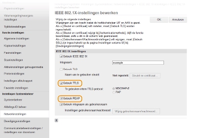 Schakel het selectievakje [Gebruik TTLS] of [Gebruik PEAP] in.