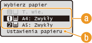 (Wybór/ustawienia papieru), aby wybrać żądany papier z poziomu ekranu <Wybierz papier>. Naciśnięcie tego przycisku pozwala również na zmianę ustawień papieru w przypadku załadowania innego niż poprzednio formatu papieru. Aby papier był właściwie podawany, ustawienia papieru muszą zostać poprawnie określone.