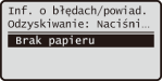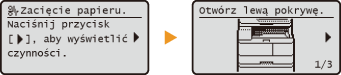 W niektórych sytuacjach po wystąpieniu błędu wyświetlone zostają wskazówki podające, jak na niego zareagować. Aby rozwiązać problem, należy postępować zgodnie z instrukcjami na ekranie. Poniżej jako przykład pokazano ekran wyświetlany w przypadku zablokowania papieru (