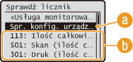 (Kontrola licznika), wyświetlony zostanie ekran <Sprawdź licznik>. Z poziomu tego ekranu można sprawdzić wartości licznika, numer seryjny urządzenia oraz jego konfigurację.