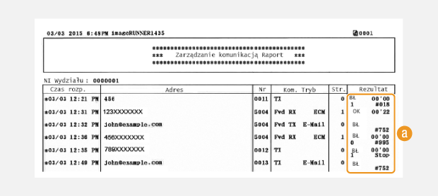 Jeśli wyświetlany jest kod błędu). W przypadku dokumentów wysyłanych przez e-mail raport zawiera wynik transmisji między urządzeniem a serwerem pocztowym, nie między urządzeniem a adresem odbiorcy.