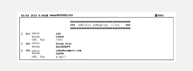 Możesz wydrukować listę aby sprawdzić szczegóły odbiorców zarejestrowanych w Książce adresowej. Listy można drukować osobno dla <Wybieranie kodowane>, <Jednoprzyciskowe> oraz <Grupa>, zgodnie z rodzajem rejestracji.