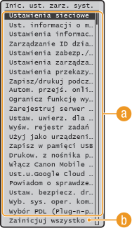 Lista menu ustawień). W przypadku niektórych ustawień, konieczny jest restart urządzenia celem zakończenia inicjowania.