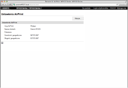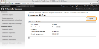 Możliwa jest rejestracja informacji, takich jak nazwa urządzenia oraz lokalizacja instalacji, które posłużą do identyfikacji urządzenia. Można również wyłączyć obsługę technologii AirPrint przez urządzenie. Aby zmienić te ustawienia, należy użyć Zdalnego interfejsu użytkownika.