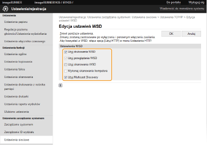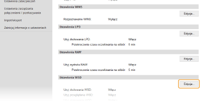 Zaznaczenie tego pola wyboru umożliwia uzyskanie informacji o urządzeniu przez komputer za pomocą interfejsu WSD. To pole wyboru jest zaznaczane automatycznie po zaznaczeniu pola wyboru [Użyj drukowania WSD]. [Użyj skanowania WSD]