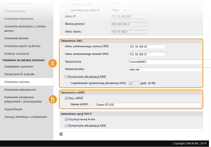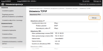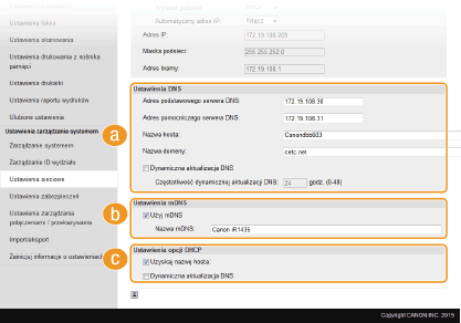Wprowadzony w programie Bonjour protokół mDNS (system DNS w trybie multiemisji) kojarzy nazwę hosta z adresem IP bez korzystania z usługi DNS. Aby włączyć protokół mDNS, należy zaznaczyć to pole i wprowadzić nazwę mDNS w polu tekstowym [Nazwa mDNS:]. [Ustawienia opcji DHCP][Uzyskaj nazwę hosta:]