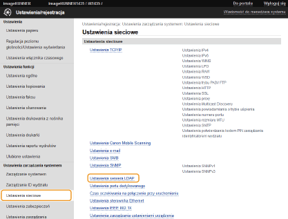 Jeśli w sieci wdrożono serwer LDAP, można wyszukiwać na nim numery faksów oraz adresy e-mail, a następnie określać je jako odbiorców lub rejestrować je w książce adresowej. Do urządzenia można zarejestrować maksymalnie pięć serwerów LDAP. Do rejestracji serwera LDAP należy użyć Zdalnego interfejsu użytkownika.