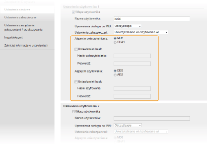 Jeśli włączone są obie wersje protokołu SNMP, zalecane jest wybranie w ustawieniach uprawnień dostępu do obiektów menedżera MIB dla protokołu SNMPv1 opcji [Tylko do odczytu]. Uprawnienia dostępu do obiektów menedżera MIB dla protokołów SNMPv1 i SNMPv3 można ustalać oddzielnie (a także osobno dla każdego użytkownika w przypadku protokołu SNMPv3). Wybranie opcji [Odczyt/zapis] (uprawnienie pełnego dostępu) dla protokołu SNMPv1 anuluje wydajne funkcje zabezpieczeń protokołu SNMPv3, ponieważ większością ustawień urządzenia można wtedy zarządzać za pomocą protokołu SNMPv1.
