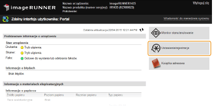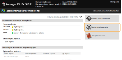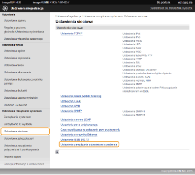 Można usprawnić pozyskiwanie różnych informacji o urządzeniach sieciowych i zarządzanie nimi dzięki wdrożeniu w sieci oprogramowania do zarządzania urządzeniami, takiego na przykład jak iW Management Console*. Informacje, takie jak ustawienia urządzeń, książka adresowa oraz dzienniki błędów, są pobierane i rozpowszechniane za pośrednictwem serwera. Jeśli urządzenie jest podłączone do tego typu sieci, oprogramowanie zarządzające urządzeniem przeszukuje sieć w poszukiwaniu urządzenia za pomocą protokołów, takich jak Service Location Protocol (SLP) w celu pobrania od niego informacji. W poniższym rozdziale opisano procedury konfiguracji ustawień SLP oraz ustawień komunikacji pomiędzy urządzeniem a wtyczkami dla iW Management Console. Te ustawienia można skonfigurować za pomocą Zdalnego interfejsu użytkownika.
