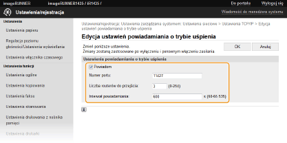 Zaznaczenie tego pola wyboru umożliwia powiadamianie oprogramowania do zarządzania urządzeniami o stanie zasilania urządzenia. Zaznaczenie opcji [Powiadom] pozwala na uniknięcie nawiązywania przez urządzenie zbędnej komunikacji w trybie uśpienia i zmniejszenie całkowitego zużycia energii. [Numer portu:]